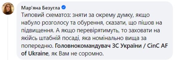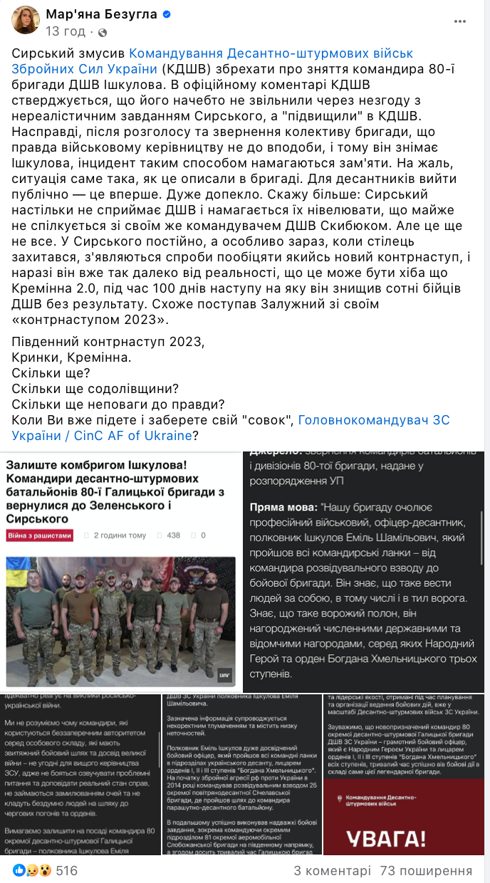 Допис Безуглої про скандал зі звільненням командира 80-ї бригади