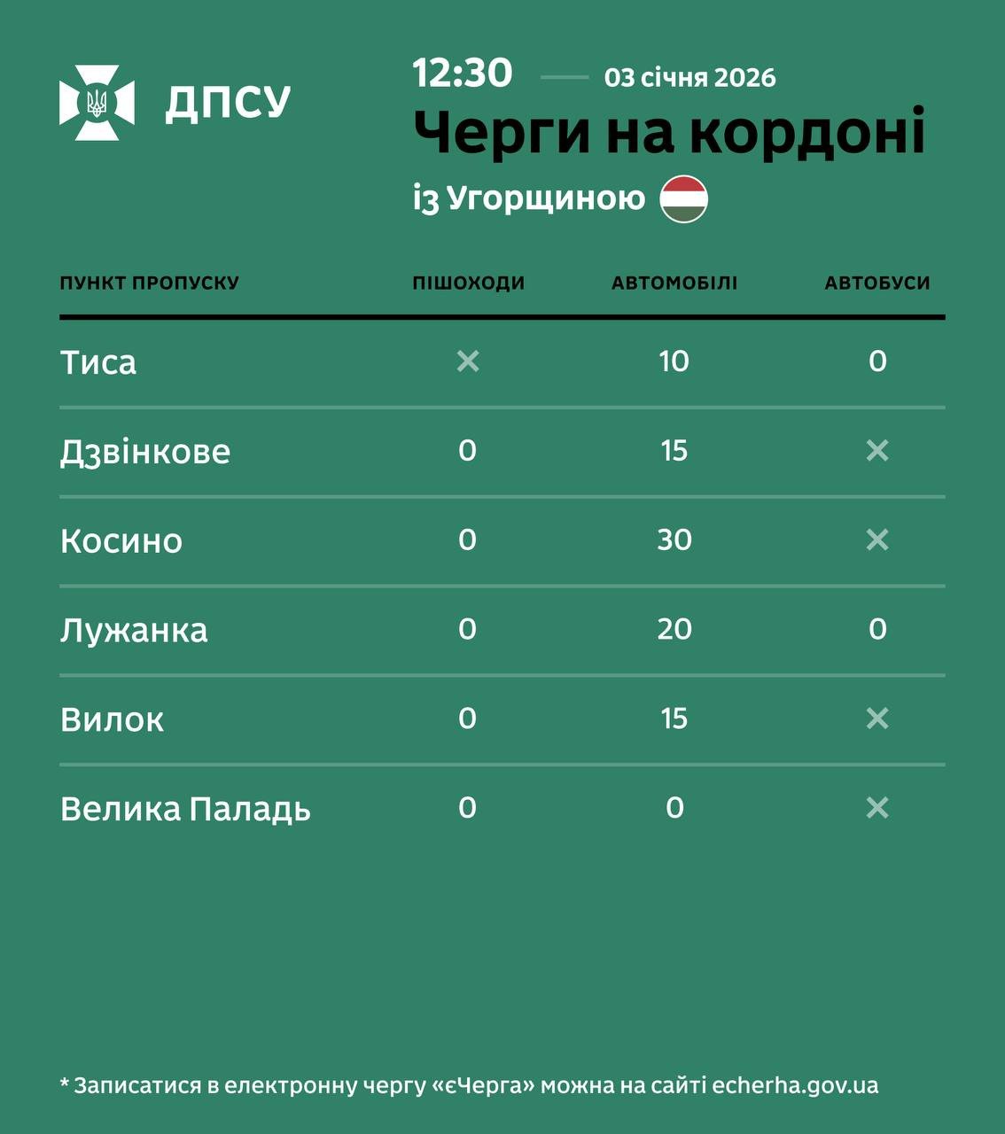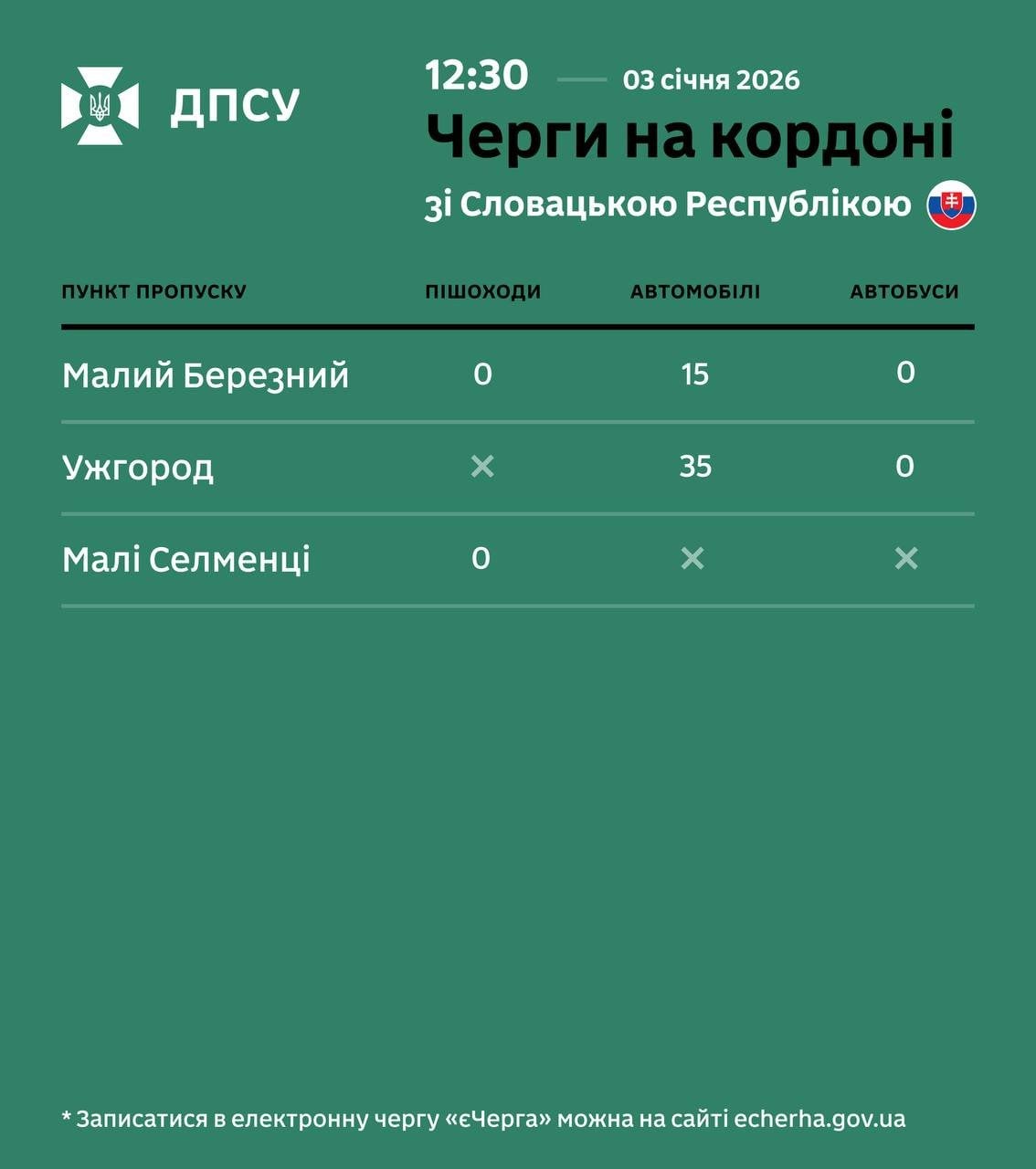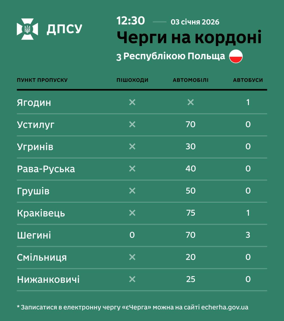Прикордонники рекомендують водіям враховувати можливі затримки та відстежувати стан черг у режимі реального часу. Також нагадуємо, що записатися в електронну чергу для автобусів можна на сайті echerha.gov.ua.