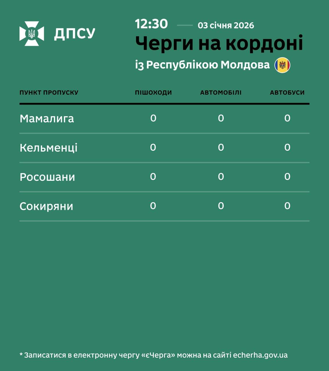 Молдова: Всі пункти пропуску («Мамалига», «Кельменці», «Росошани», «Сокиряни») працюють у вільному режимі — черг немає.