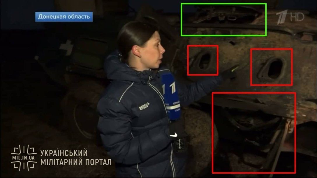 Дослідник Стейн Мітзер із нідерландського проєкту Oryx зазначає, що на опублікованому відео в російських ЗМІ зі згорілим БТР демонструють техніку, якої немає на озброєнні Збройних Сил України.