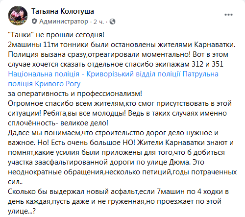 "Танки" не пройшли сьогодні! 2 машини 11-тонники були зупинені жителями Карнаватки. Поліція викликана відразу, відреагували миттєво! Жителі Карнаватки знають і пам'ятають, яких зусиль було докладено для того, щоб домогтися ділянки асфальтовій дороги по вулиці Дюма. Це неодноразові звернення, кілька петицій, роки витрачених сил. Скільки б витримав новий асфальт, якщо 7 машин по 4 ходки на день кожна, нехай навіть і не навантажена, але проїжджає по цій вулиці? Мало того, це все робилося під знаки заборони", — повідомила Тетяна.