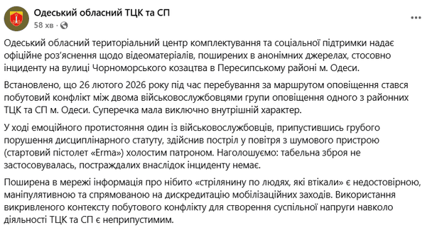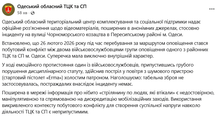 «Встановлено, що 26 лютого 2026 року під час перебування за маршрутом оповіщення стався побутовий конфлікт між двома військовослужбовцями групи оповіщення одного з районних ТЦК та СП м. Одеси. Суперечка мала виключно внутрішній характер. У ході емоційного протистояння один із військовослужбовців, припустившись грубого порушення дисциплінарного статуту, здійснив постріл у повітря з шумового пристрою (стартовий пістолет „Erma“) холостим патроном», — йдеться в повідомленні.