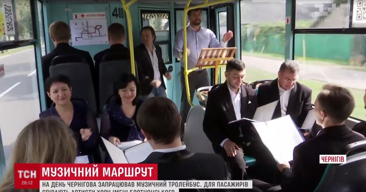 У Чернігові на день міста на маршрут вирушив музичний тролейбус. Серед звичайних пасажирів просто під час поїздки співали наживо артисти хору імені Бортнянського, йдеться в сюжеті ТСН.19:30.