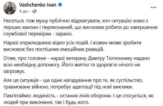«Але ця ситуація — ще одне нагадування про те, як суспільство, травмоване війною, потребує адаптації під нові виклики. Пам’ятаймо: людяність — остання лінія оборони. І це стосується, як людей при виконанні, так і будь-кого», — каже представник ОВА.