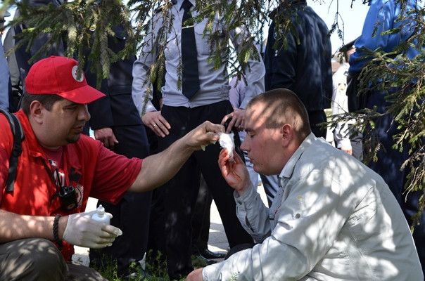 "Цього року комуністи вирішили заявити про свою присутність. До парку Слави підвезли музичну апаратуру та кілька десятків людей похилого віку з районних центрів області. Були з комуністами й чоловіки середнього віку, які намагалися керувати процесом, перебуваючи осторонь, та молоді люди характерної спортивної статури", — йдеться в повідомленні.