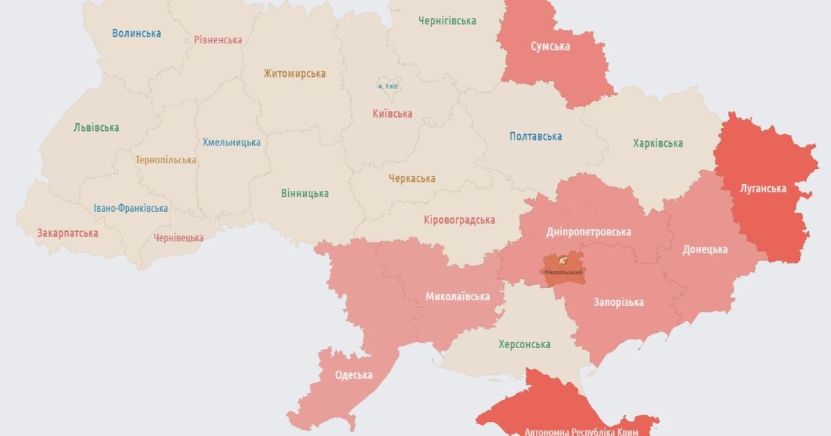 У Сумській, Донецькій, Луганській, Запорізькій, Дніпропетровській областях та автономній республіці Крим оголошена повітряна тривога.
