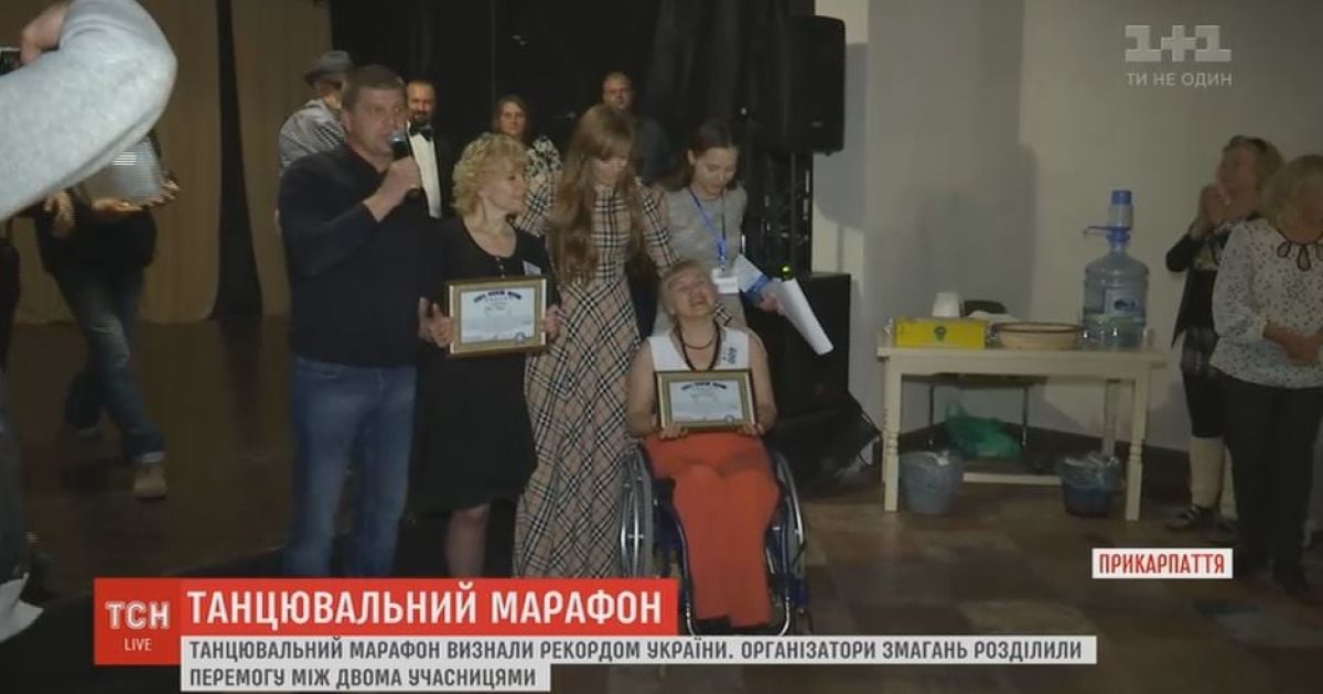 6 годин протрималися на паркеті учасники марафону. Перемогу та приз організатори розділили між двома 51-річними жінками. Вони удвох залишилися на танцполі і тривалий час не поступалися одна одній. Оксана Шарак вже кілька років прикута до візка, збирає гроші на пандус, аби мати можливість виходити надвір.