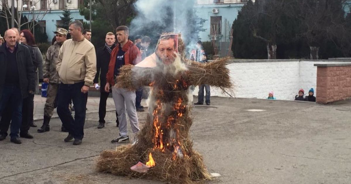 У Сімферополі біля будівлі Ради міністрів Криму спалили опудало президента Туреччини Реджепа Таїпа Ердогана. Опудало виготовили з соломи, а до його голові прикріпили фотографію турецького лідера.