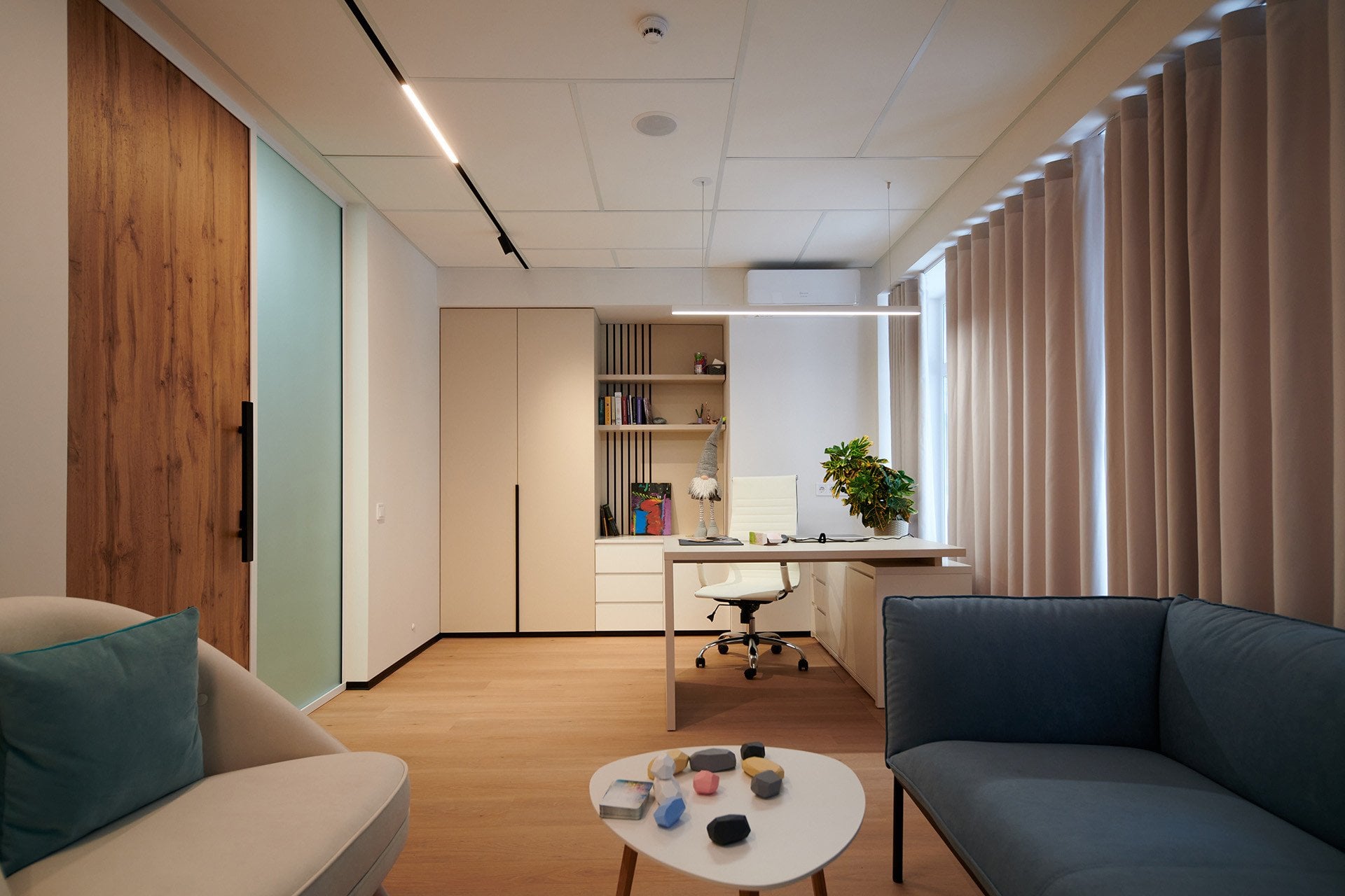 Простір київського центру ПОВЕРНЕННЯ продуманий для комплексної роботи й включає кімнати індивідуальної та групової терапії, палату денного стаціонару, маніпуляційний кабінет, ординаторську, а також зону рецепції з комфортним простором для очікування. Усе середовище вибудувано так, щоб знижувати рівень напруги, формувати відчуття спокою і довіри та підтримувати процес психологічного відновлення.