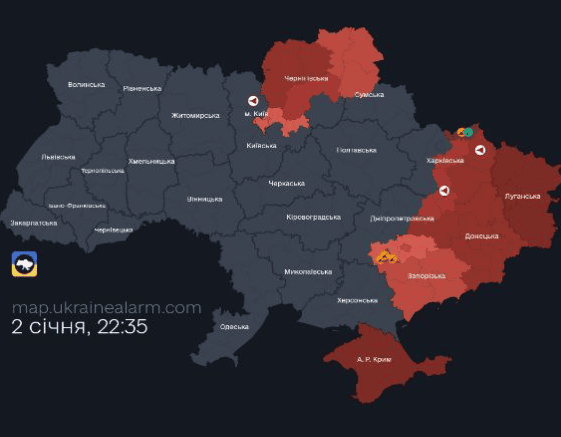 Повітряна тривога також оголошена в Чернігівській, Запорізькій, Донецькій, частині Харківської, Дніпропетровській, Сумській, Київській областях, а також АР Крим.
