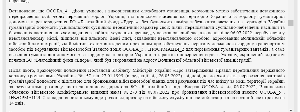 За даними суду, директор організації "Благодійний фонд "Едера" оформлював військовозобов'язаних чоловіків як "водіїв, які їхали за кордон за гуманітарною допомогою". Дозволи на це надавала місцева ОВА. Проте водії із-за кордону так і не поверталися. Деякі з ухилянтів перетинали кордон на піших пунктах пропуску, оскільки вони мали відстрочку від мобілізації на 14 днів.