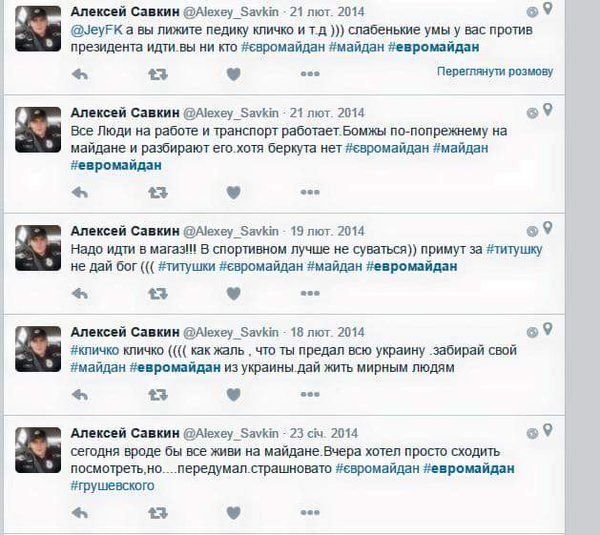 "Бісить опозиція, немає слів. Україна, Беркут, розженіть цих бомжів, які називають себе українцями. Ганьба вам", - писав полісмен у лютому 2014.
