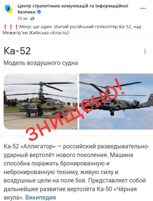 В Центрі стратегічних комунікацій повідомляють, що над Межигір'ям Київської області збитий російський вертоліт Ка-52.