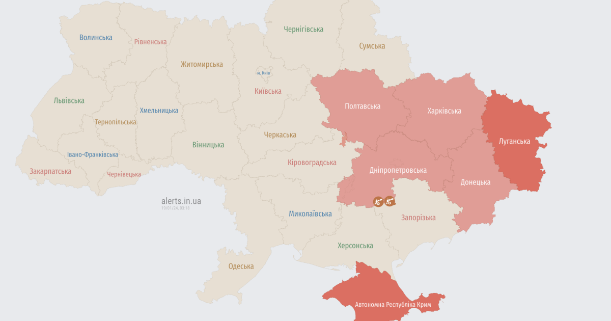 В ніч проти 19 січня Повітряні сили оголосили повітряну тривогу через загрозу застосування ракетного озброєння для низки областей.