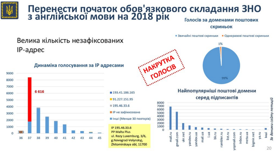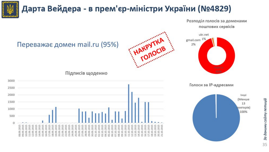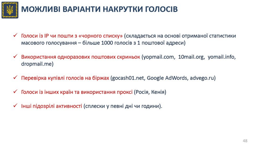 — APU (@APUkraine) 13 ноября 2015 Серед порушень у голосуванні за петицію було виявлено накрутку голосів, їхній продаж та примусове залучення студентів.