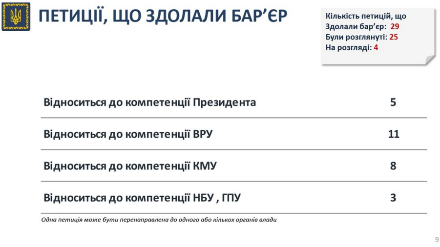 Інші ж стосуються компетенції ВР (11 петицій), КМУ (8 петицій) та НБУ й ГПУ (3 петиції).