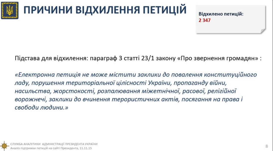 Серед усіх петицій 2 347 було відхилені, оскільки підпадали під параграф 3 статті 23/1 закону "Про звернення громадян".