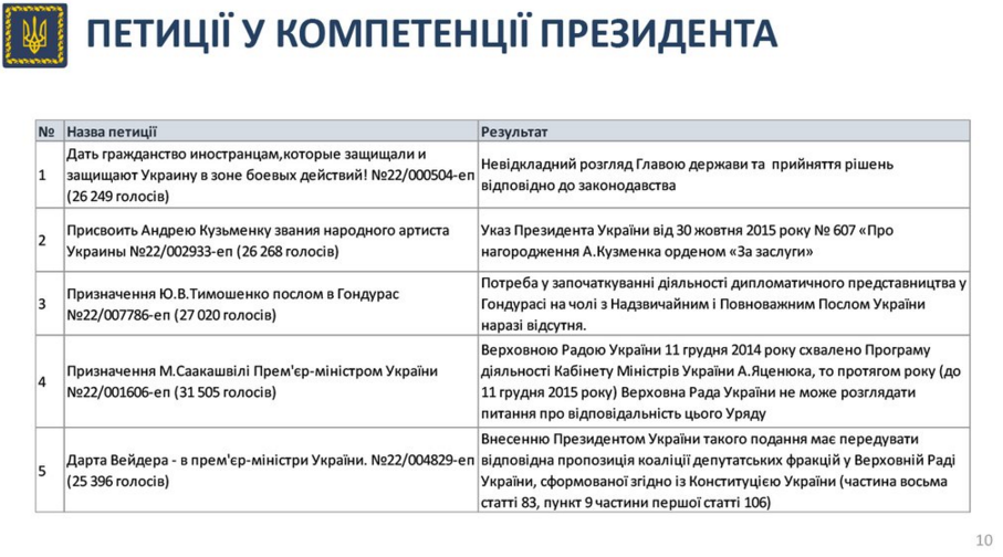 — APU (@APUkraine) 13 ноября 2015 Відповідно до популярності, в АП розділили петиції за 4 критеріями.