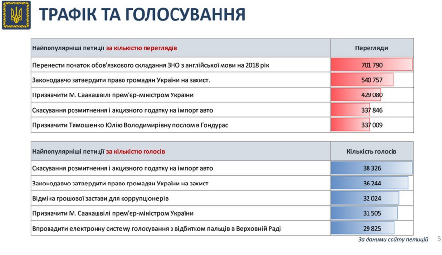 За кількістю переглядів лідирує петиція про "Перенесення обов'язкового складання ЗНО з англійської мови на 2018 рік" із 701 790 переглядами.