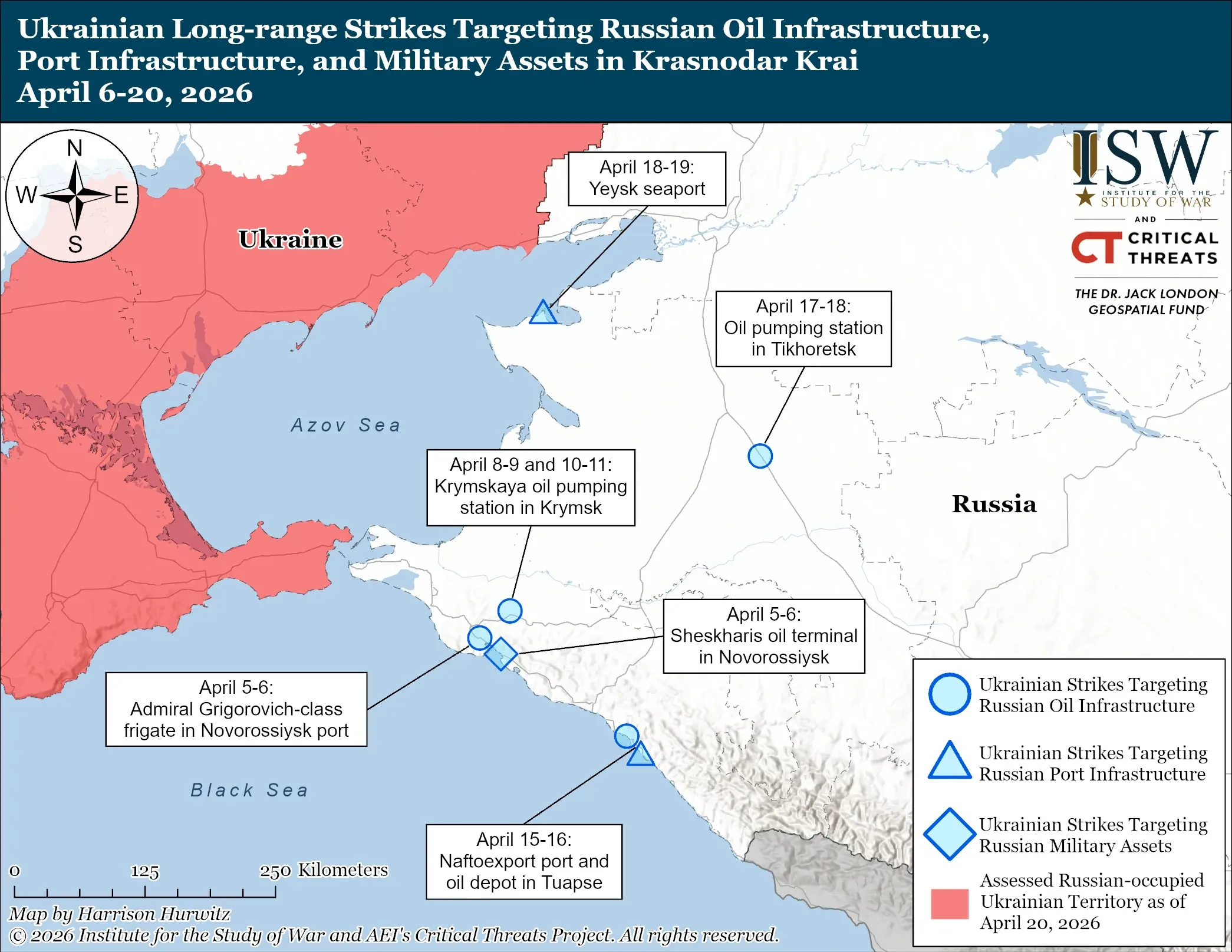 5–6 квітня: нафтовий термінал «Шесхаріс» та фрегат класу «Адмірал Григорович» біля Новоросійська.