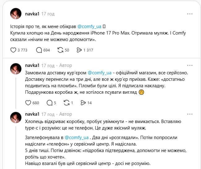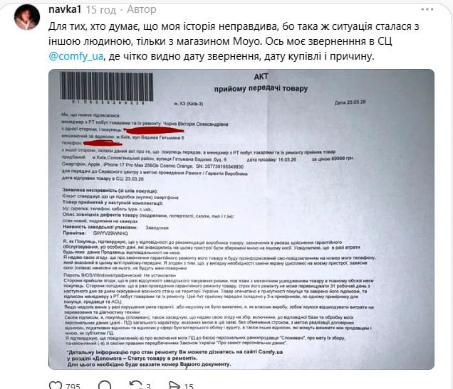 Після скарги в Comfy апарат забрали на експертизу. Проте після п’яти днів очікування дівчині зателефонували з відмовою. Їй повідомили: «підробка підтверджена, допомогти не можемо, робіть що хочете». Клієнтка обурена, адже магазин навіть не надав IMEI-номер для блокування пристрою через систему Apple.