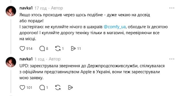 «Зареєструвала заявку в офіційній підтримці Apple, але вони теж нічим не можуть допомогти, заблокувати IMEI також не можуть. Оскільки в мене на чеку немає інформації про ІМЕІ, а Comfy відмовився мені її надати», — додала вона.