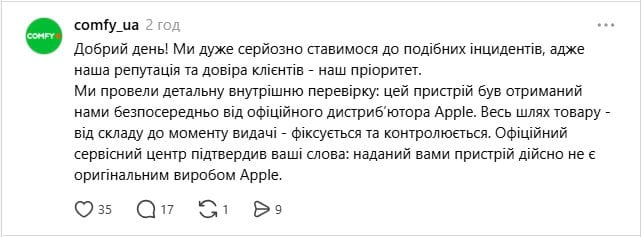Представники Comfy у коментарях зазначили, що проводять внутрішню перевірку, але наполягають: пристрій отримано від офіційного дистриб’ютора, а весь шлях товару фіксується.