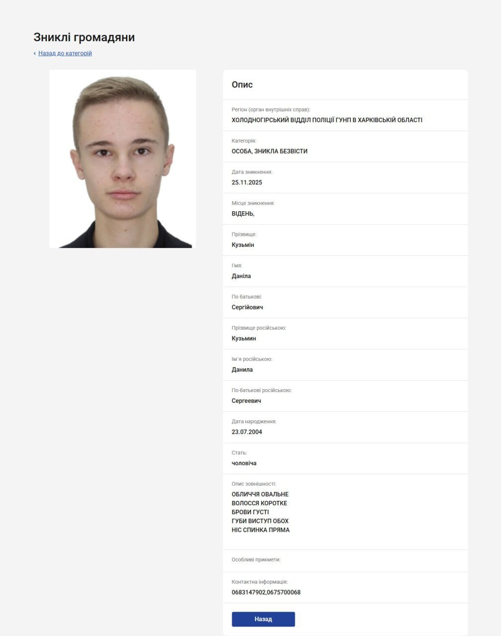 2 грудня у базі МВС України з’явилася картка про розшук Данила Сергійовича Кузьміна, який зник 25 листопада 2025 року у Відні. У розшук його оголосив Холодногірський відділ поліції Харківщини як сина заступника міського голови.