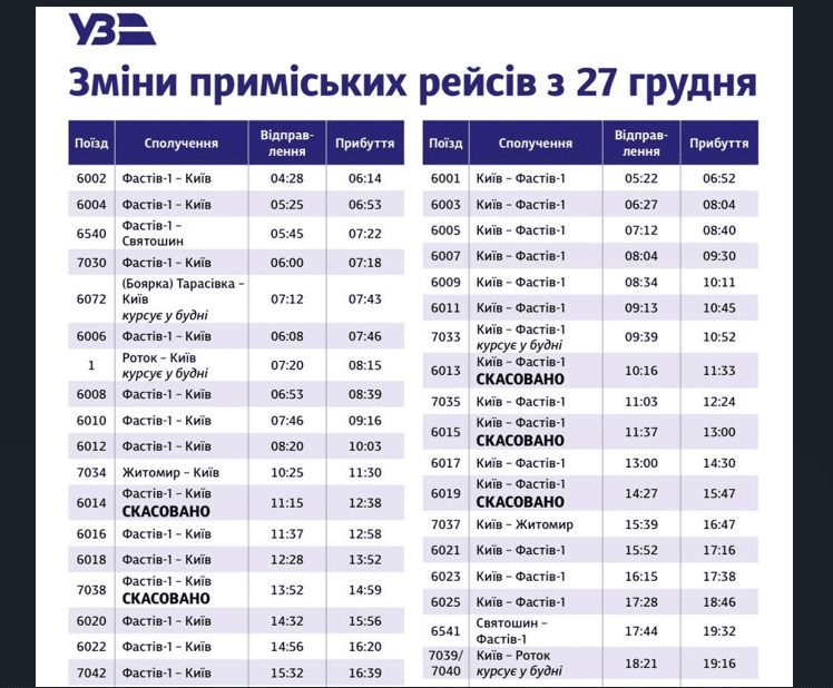 Від 27 грудня “УЗ” запровадила обмеження в русі приміських потягів. Тимчасово не курсуватиме п’ять найменш населених денних рейсів. Водночас рух у напрямку столиці, Козятина, Житомира, Боярки, Вишневого, Білої Церкви, Миронівки, Тарасівки, Славутича, Чернігова та інших буде збережено. Столичні рейси прямуватимуть у складі восьми, а деякі - десяти вагонів, аби перевезти більше пасажирів.