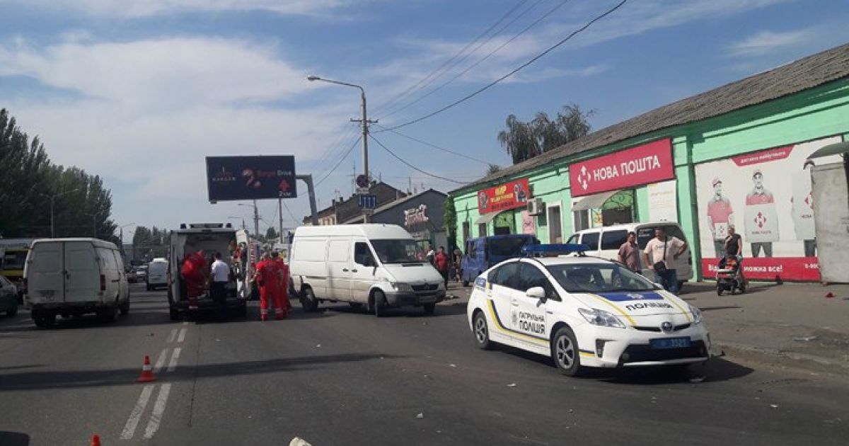 В Одесі на Миколаївській дорозі мікроавтобус зіткнувся з вантажівкою і вилетів на тротуар, де збив пішоходів.
