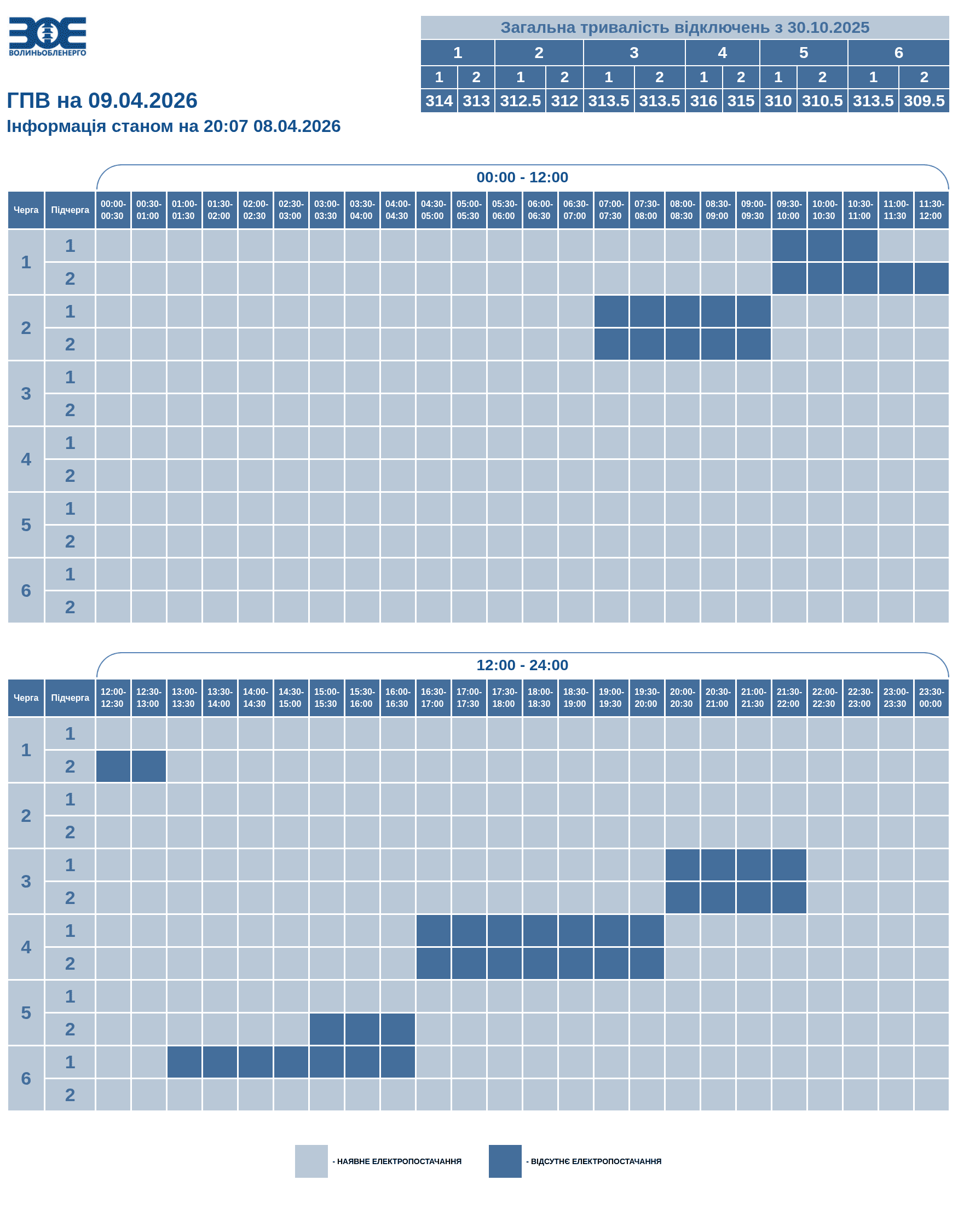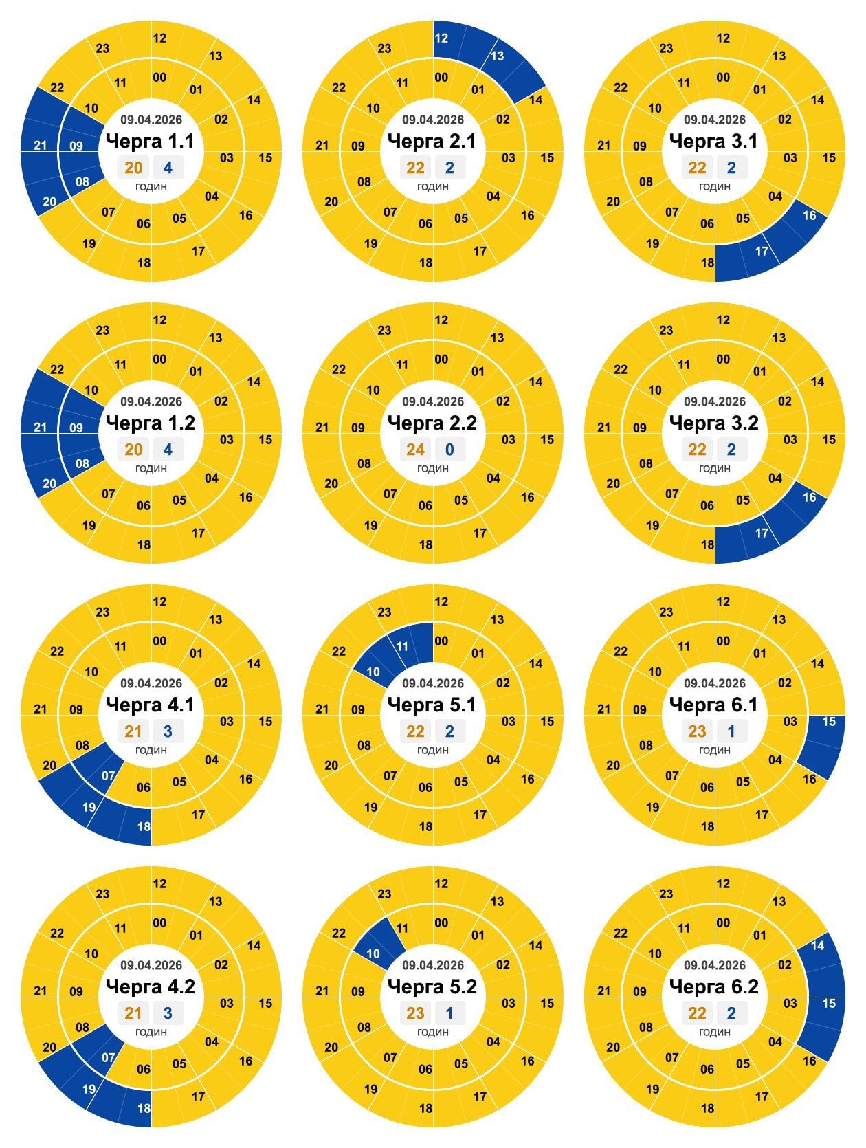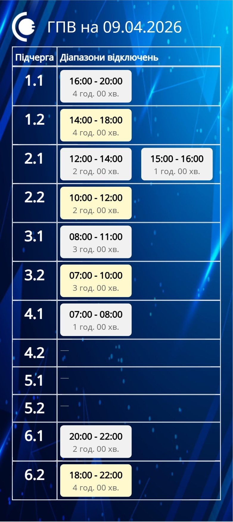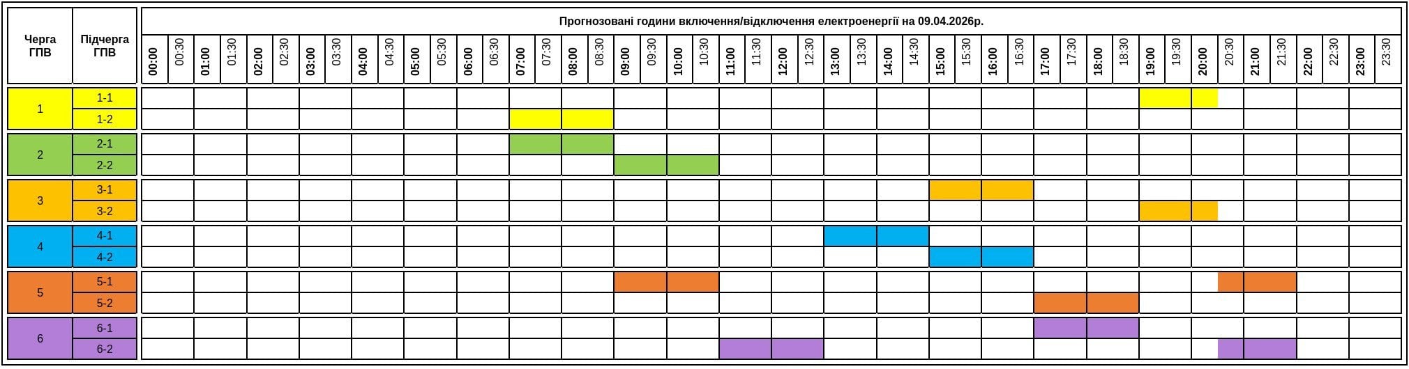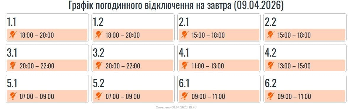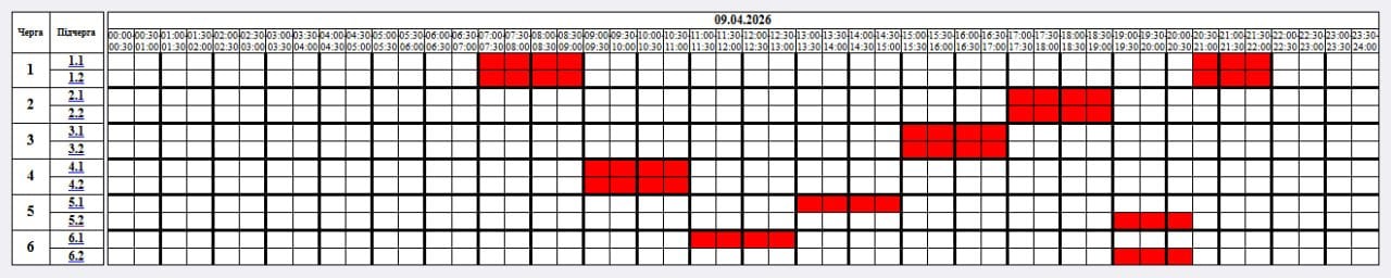 За розпорядженням НЕК «Укренерго» 09.04.2026 буде діяти наступний графік погодинних відключень (ГПВ):