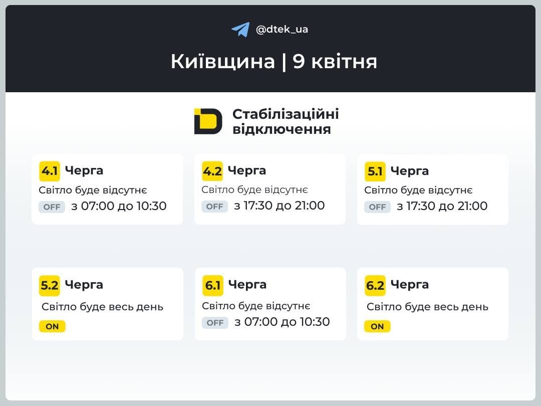 За повідомленням ДТЕК, на Дніпропетровщині запровадять наступні графіки відключення на 9 квітня.