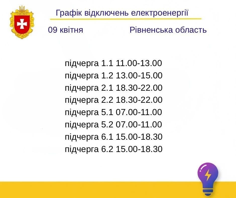 Укренерго дало команду запровадити на Рівненщині у четвер, 9 квітня, графік погодинних відключень електроенергії: