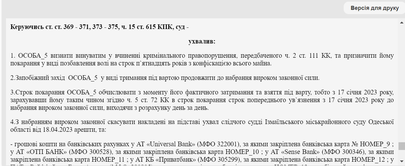 Суд проаналізував матеріали справи та визнав жителя Одещини винним за ч. 2 ст. 111 КК та засудив до 15 років позбавлення волі з конфіскацією майна.