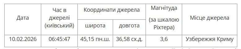 «10 лютого 2026 року Головним центром спеціального контролю зареєстровано землетрус поблизу узбережжя Кримського півострова, магнітудою 3,6 (за шкалою Ріхтера)», — йдеться у повідомленні.