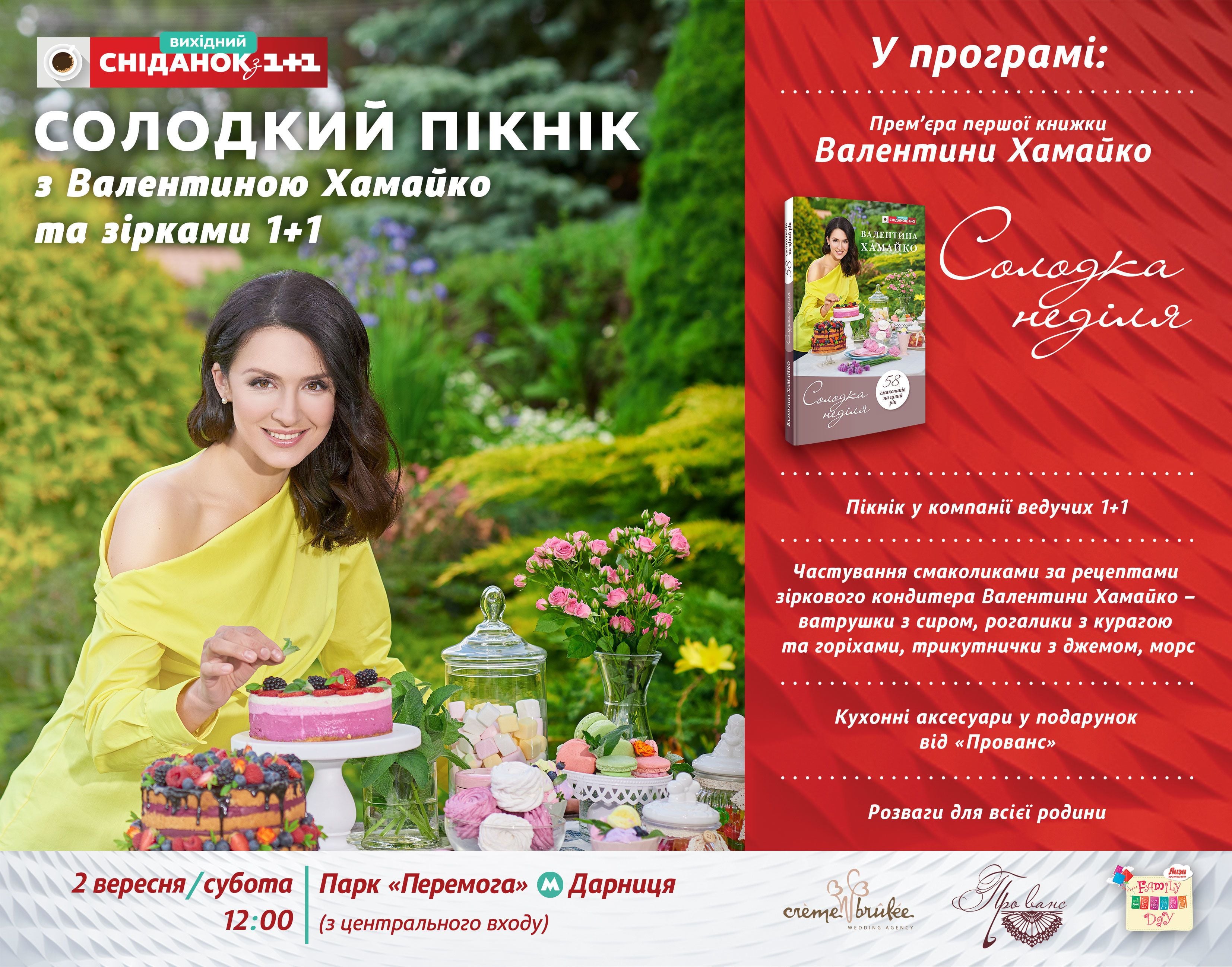 Вже цієї суботи, 2 вересня, о 12:00 у київському парку "Перемога" (станція метро "Дарниця") на фестивалі Family Day з'явиться особливий, затишний і смачний, майданчик "Солодкий пікнік". Ловимо разом останні сонячні моменти, влаштовуємо великий солодкий пікнік, проводимо весело та цікаво час із розвагами для всієї родини, насолоджуємося приємною бесідою у товаристві улюблених ведучих 1+1, з квітами, солодощами, фруктами, яскравим фотомайданчиком, сімейними змаганнями та подарунками! Ведучі "Сніданку" Руслан Сенічкін та Єгор Гордєєв стануть головними господарями великого родинного пікніка, а в гості до них завітає чарівна ведуча "Сніданок. Вихідний", турботлива матуся та дружина Валентина Хамайко. Вона представить свою першу кулінарну книжку рецептів родинних десертів "Солодка неділя", а також пригостить ароматними ватрушками, домашніми рогаликами з горіхами та курагою і смачними трикутничками з джемом за рецептами з її книжки.