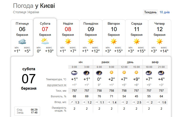 За даними порталу Sinoptik, 7 березня вранці у столиці розпогодиться, досвіткові хмари зникнуть і до кінця дня більше не з’являться. Опадів не передбачається.