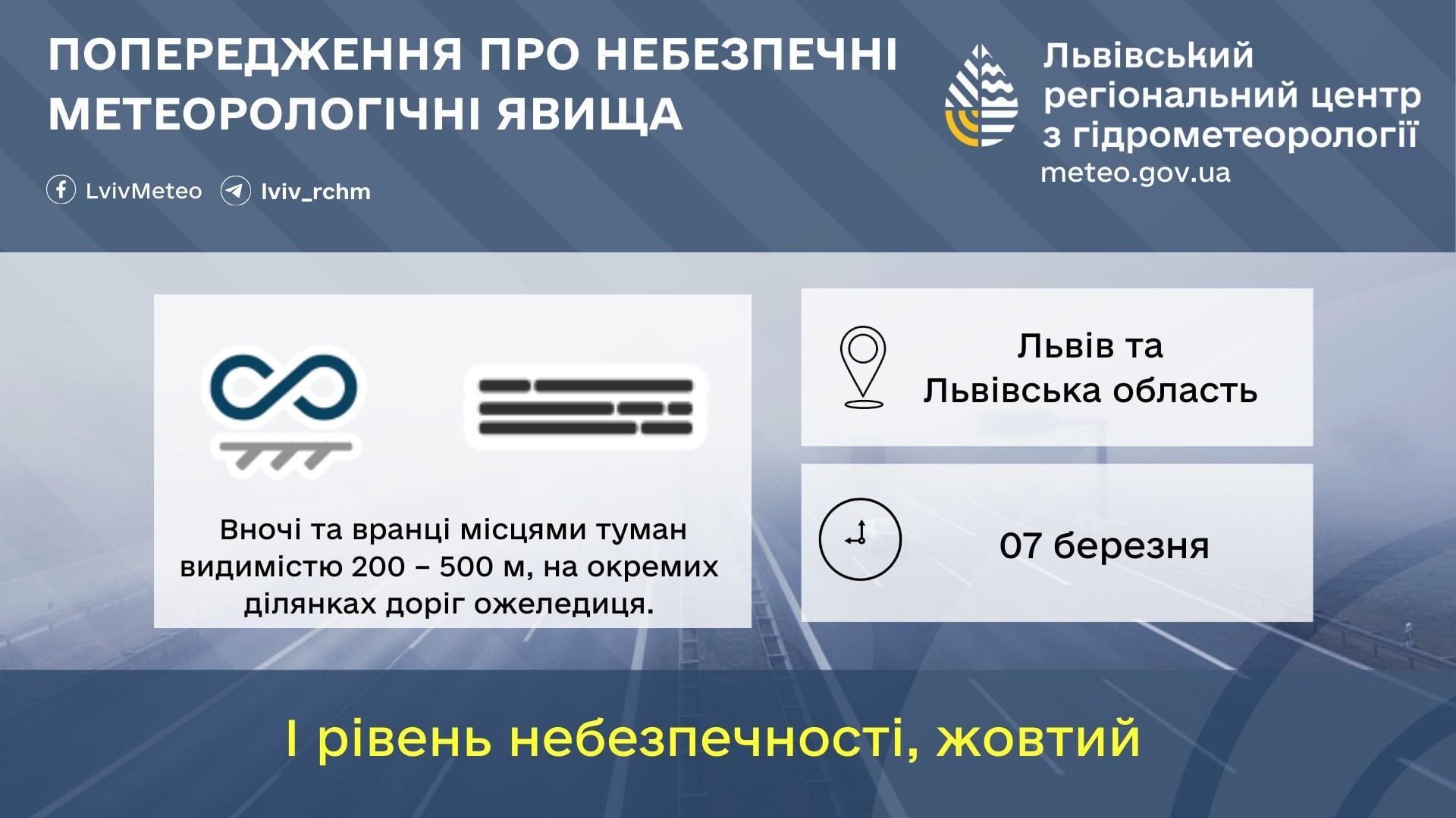 Водночас синоптики попереджають про жовтий рівень небезпечності: вночі та вранці 7 березня очікується туман із видимістю 200–500 м. На окремих ділянках доріг можлива ожеледиця, тому водіям варто бути особливо уважними.