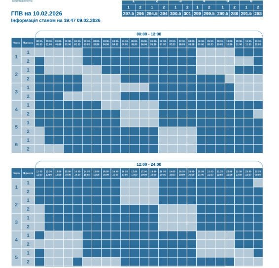 Попередній прогноз по застосуванню ГПВ на вівторок, 10 лютого. Погодинні графіки діятимуть з 00:00 до 23:59. В розрізі підчерг попередній прогноз виглядає так: