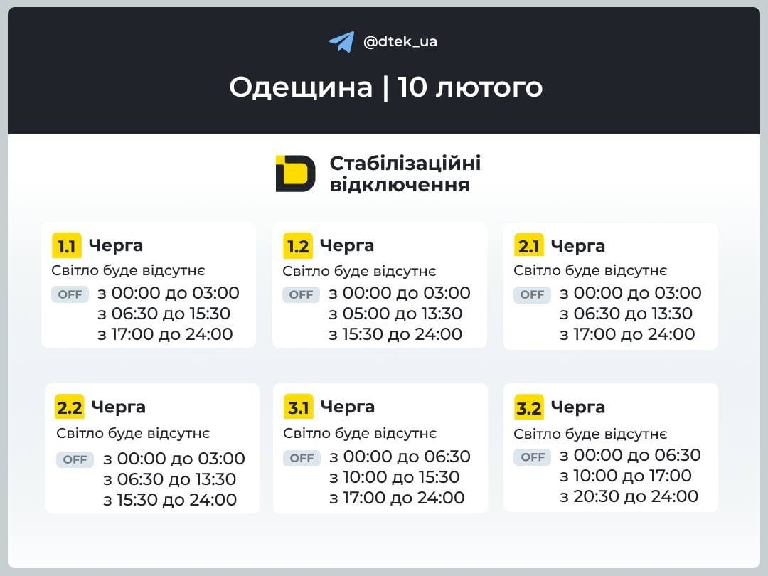 Одеса, частково Одеський район і деякі районні центри Одещини — тривають екстрені відключення. Проте 10 лютого Одеській області діятимуть такі графіки відключення: