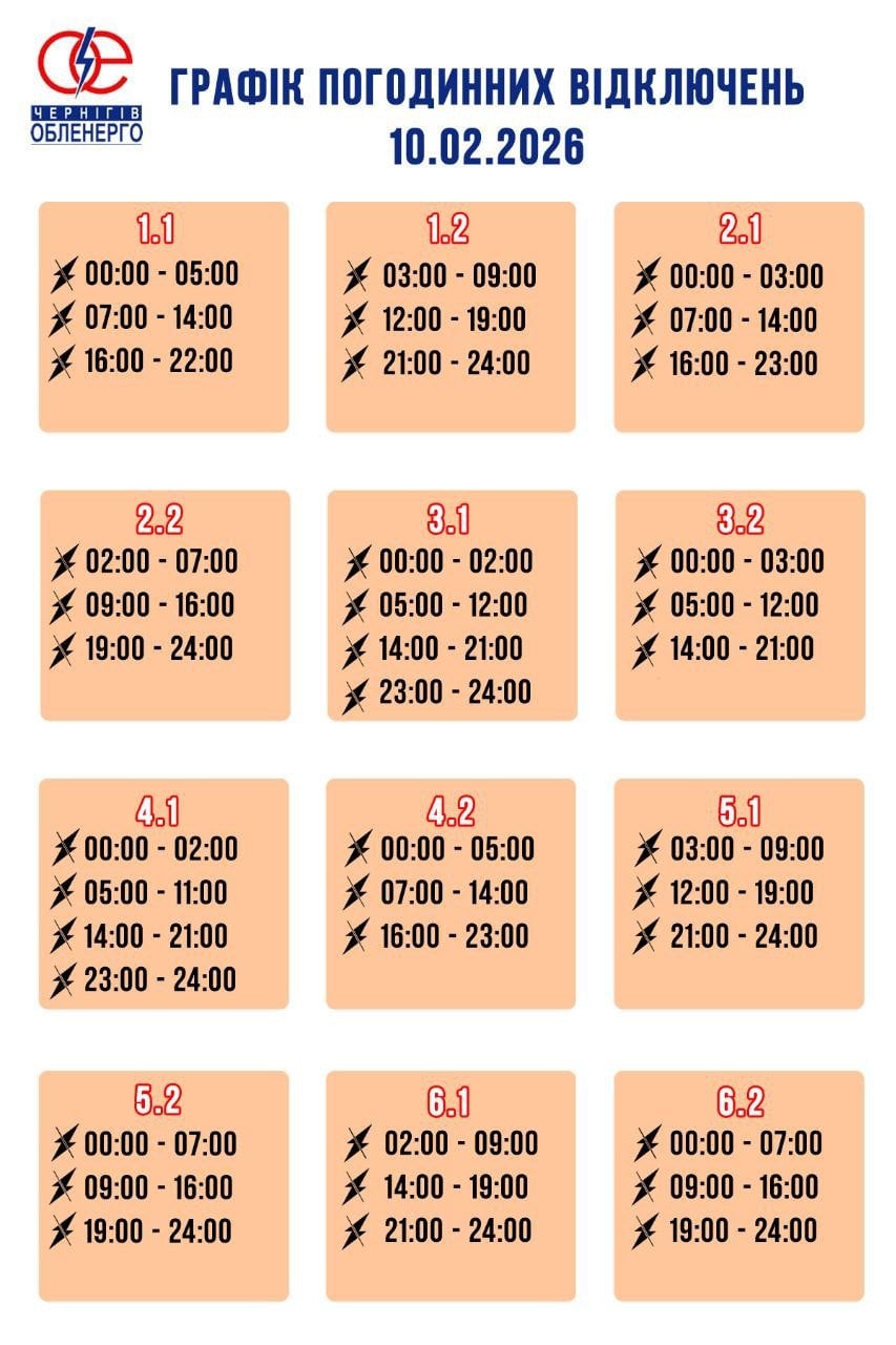 У Кіровоградській області 10 лютого також діятимуть графіки погодинних відключень. Світло у помешканнях з’являтиметься лише упродовж 3-5 годин на добу. За розпорядженням НЕК «Укренерго» 10.02.2026 буде діяти наступний графік погодинних відключень (ГПВ):