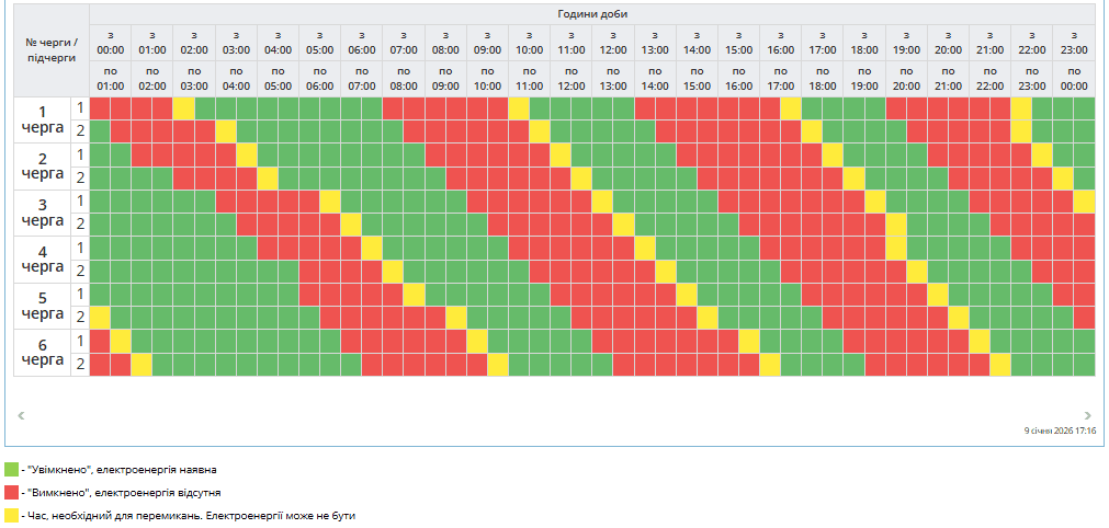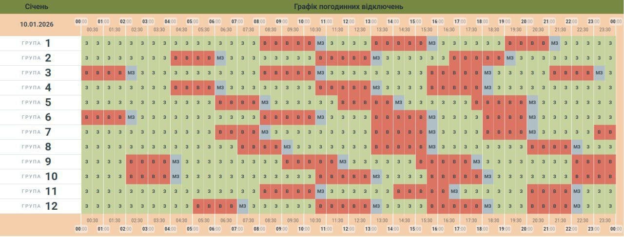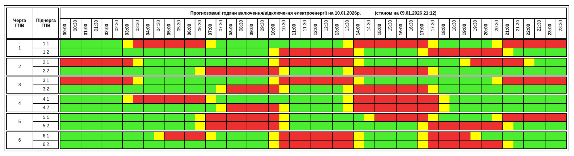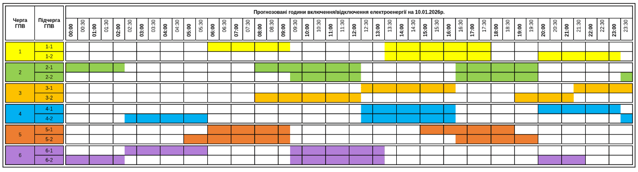 В усіх регіонах Україні у субботу, 10 січня, будуть запроваджені графіки погодинних відключень світла. Причина обмежень електропостачання — наслідки російських масованих ракетно-дронових атак на енергооб’єкти.