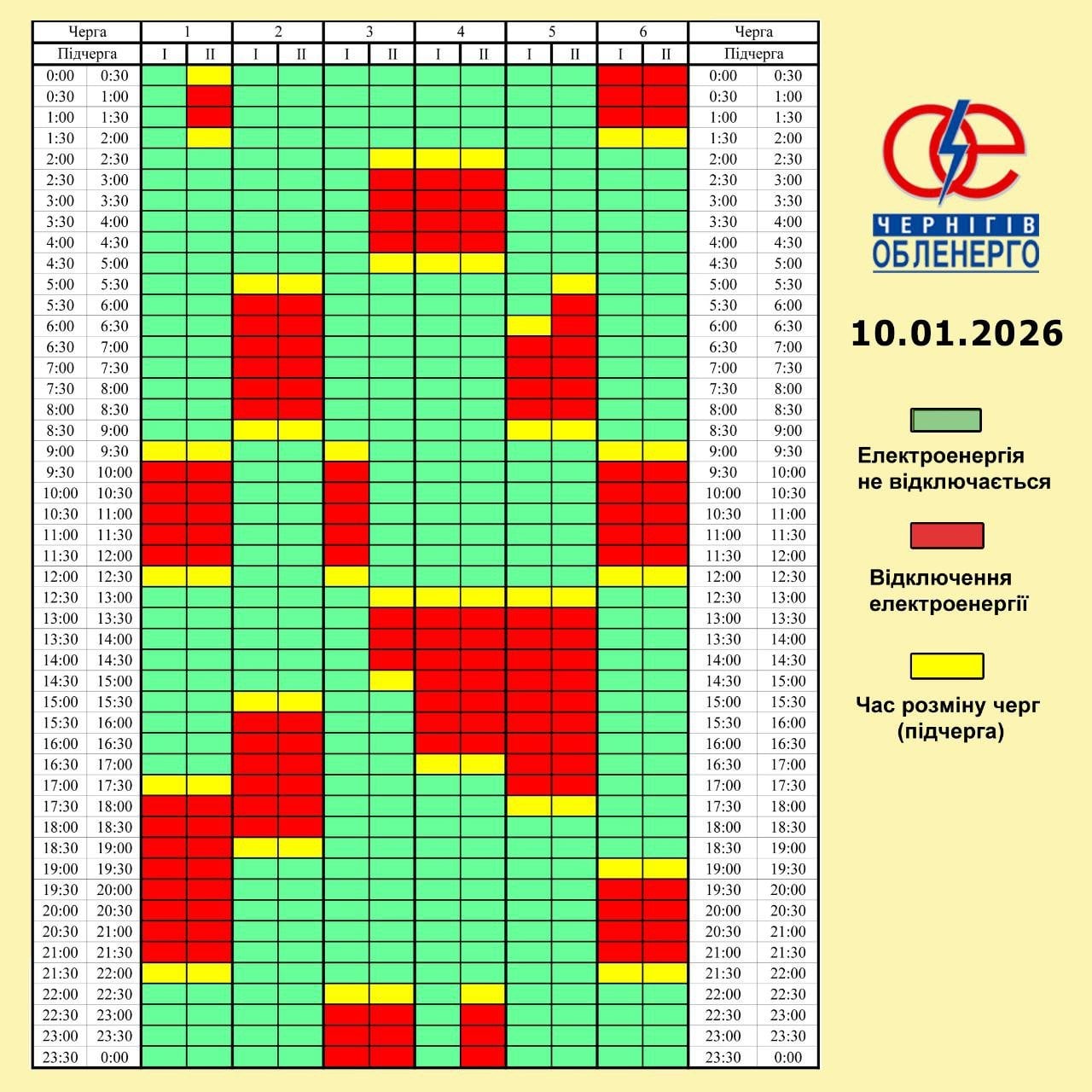 Графік відключення світла на Чернігівщині 10 січня