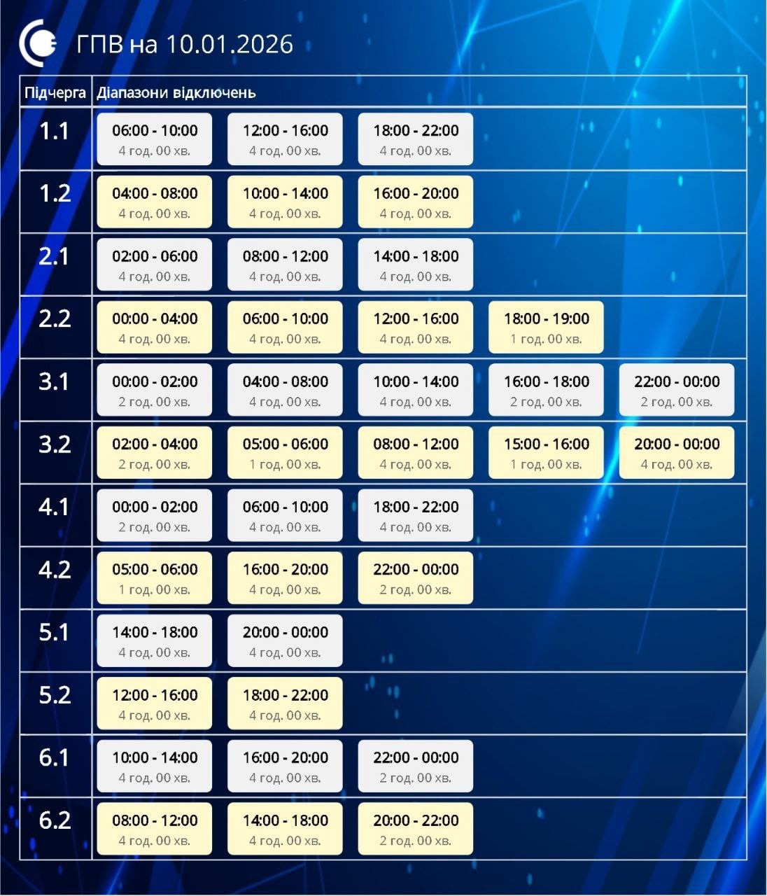 Відключення світла 10 січня: актуальні графіки для всіх областей