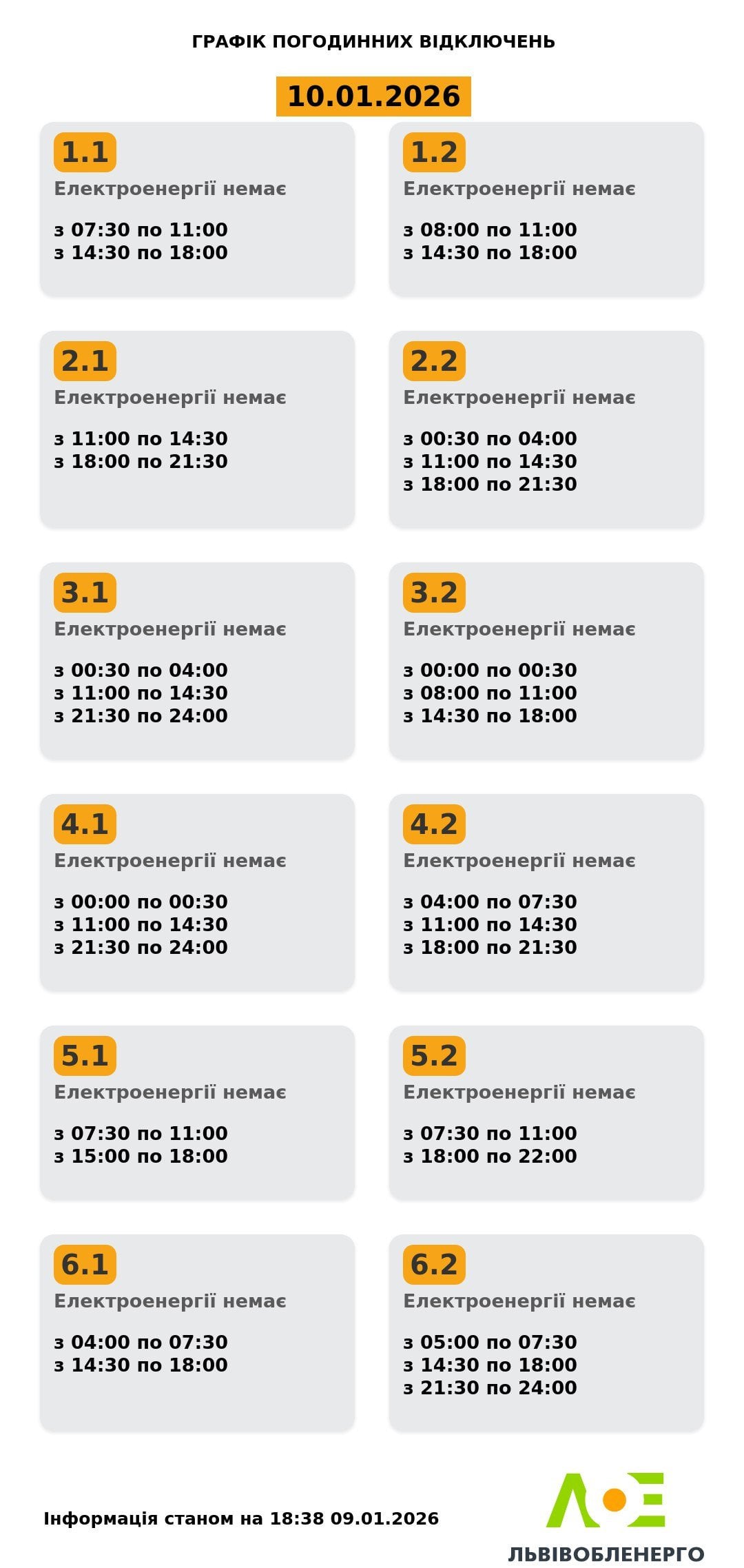 Графік відключення світла на Львівщині 10 січня