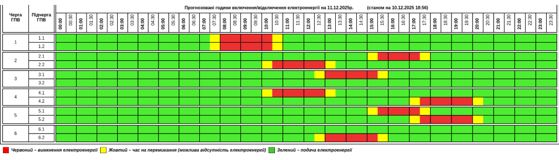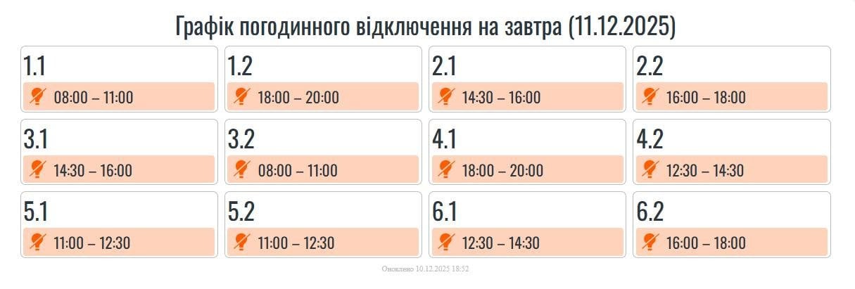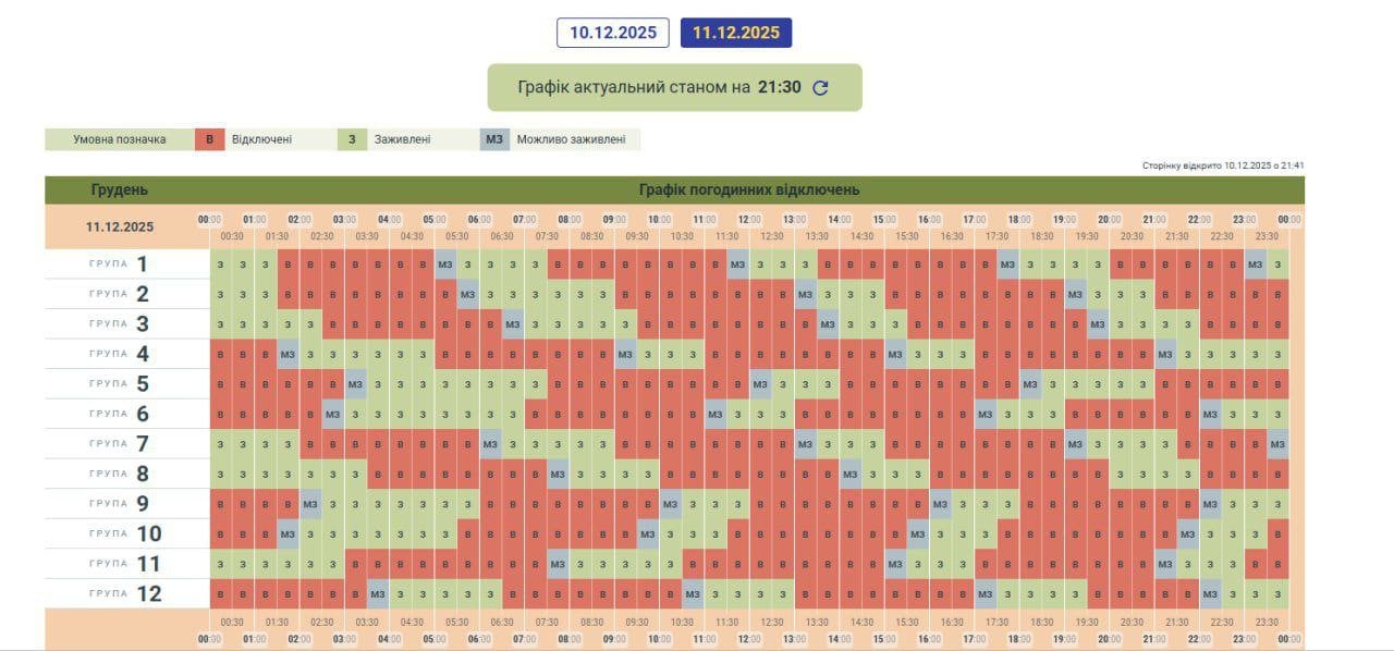 ДТЕК анонсував графіки погодинних відключень світла на четвер, 11 грудня, для столиці та всіх регіонів України.