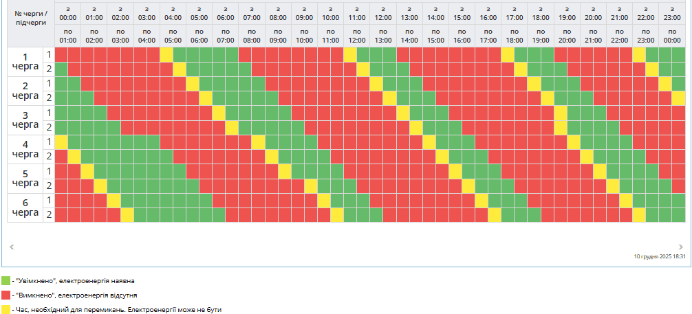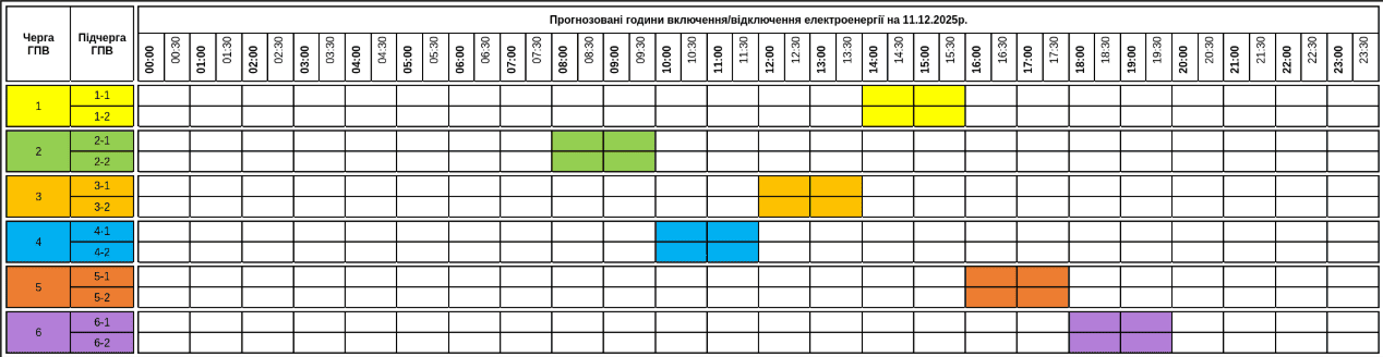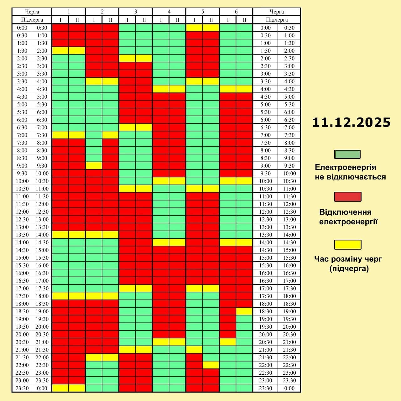 В усіх регіонах Україні у четвер, 11 грудня діятимуть графіки погодинних відключень світла. Причина запровадження обмежень — наслідки попередніх російських масованих ракетно-дронових атак на енергооб’єкти.