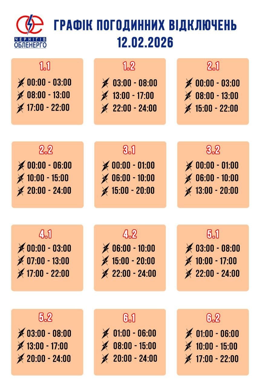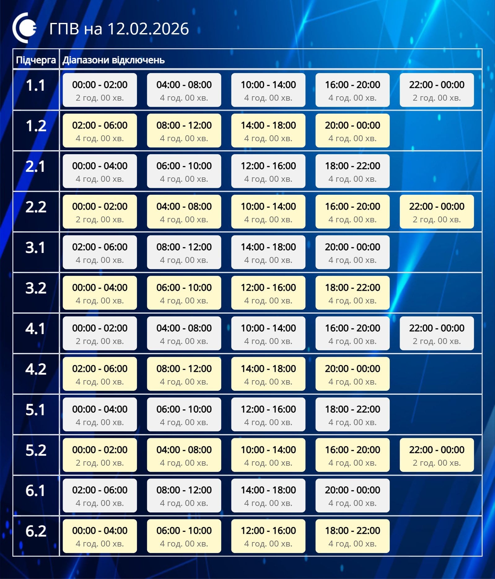 В усіх регіонах Україні у четвер, 12 лютого, будуть запроваджені графіки погодинних відключень світла. Причина обмежень електропостачання — наслідки російських масованих ракетно-дронових атак на енергооб’єкти.