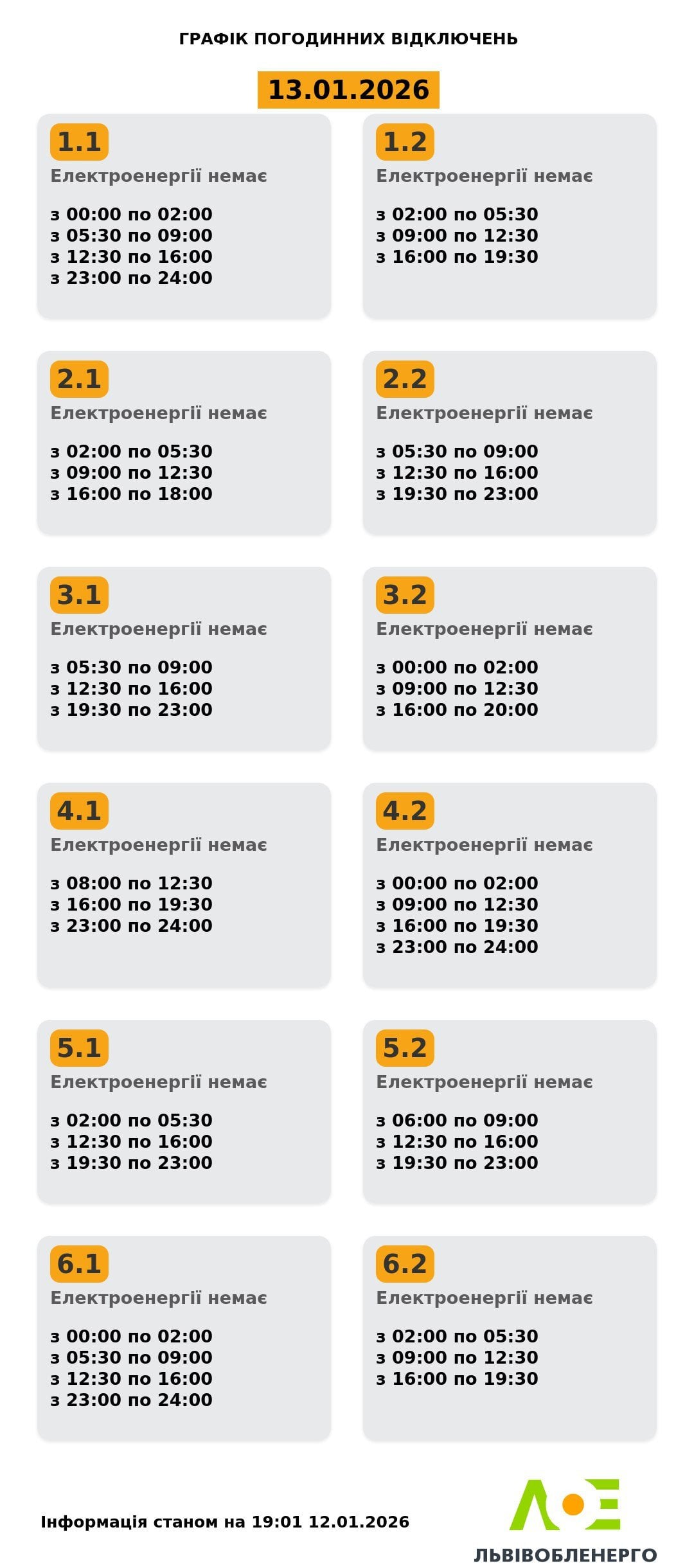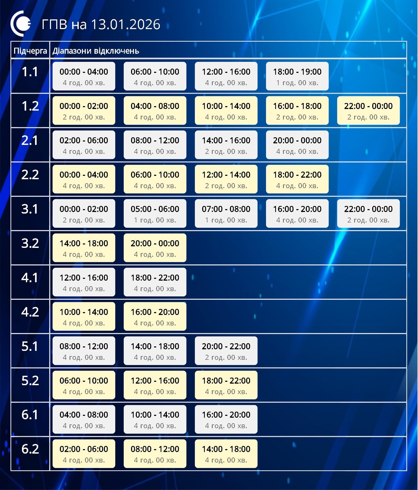 13 січня в регіоні діятимуть наступні графіки відключень:
