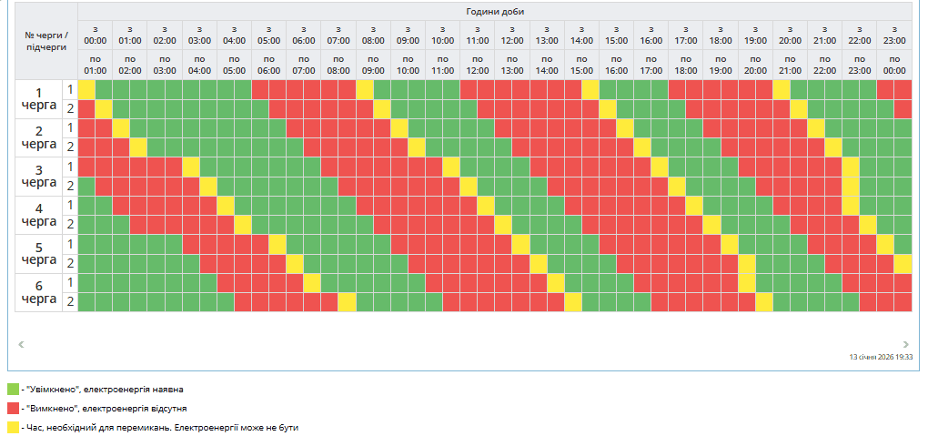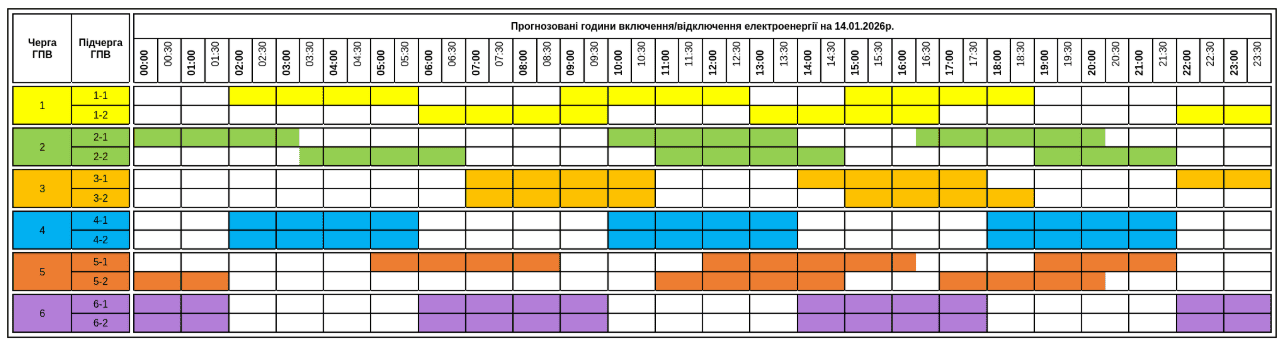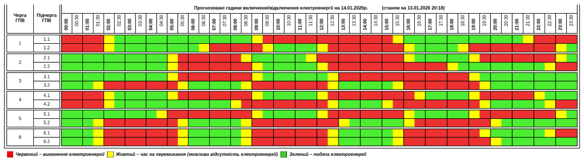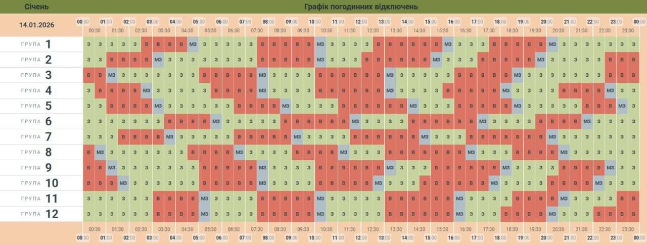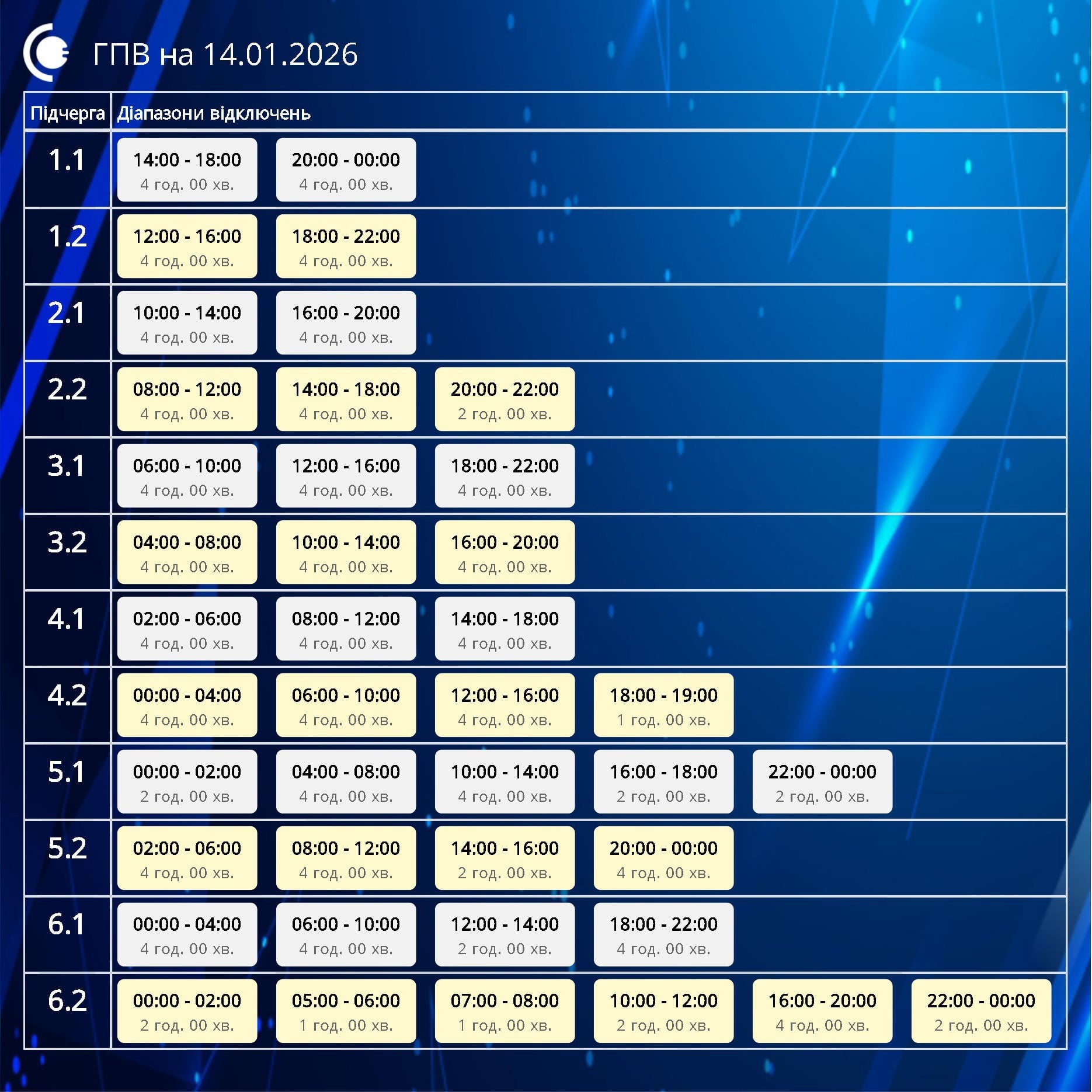 В усіх регіонах Україні у середу, 14 січня, будуть запроваджені графіки погодинних відключень світла. Причина обмежень електропостачання — наслідки російських масованих ракетно-дронових атак на енергооб’єкти.